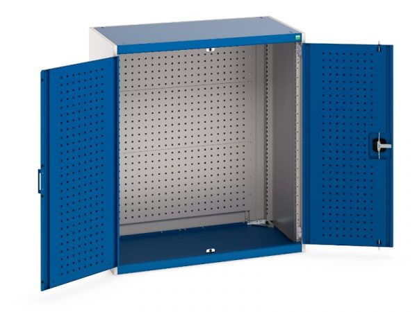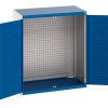 cubio panel cupboard. Featuring a heavy duty, reinforced steel housing with up to 1 tonne total capacity with double, perfo panel lined, reinforced doors with perfo backpanel. Finished in durable powder coat paint in RAL 7035 light grey / RAL 5010 gentian blue. WxDxH: 1050x650x1200mm