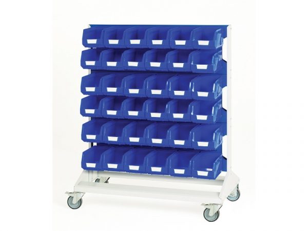 Parts Bin Trolley on wheels – Parts Bin Storage – Louvre panel trolley double sided & bins with 6 panels, 72x blue bins.WxDxH: 1000x550x1250mm.Available in 4 colours_SKU-16917272.11V